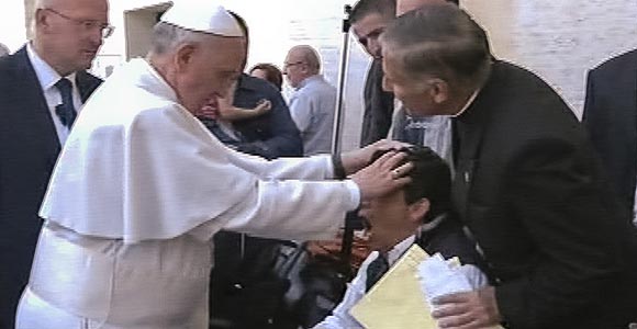 پاپ روز یکشنبه هنگامی که از خودروی مخصوص خود در میدان مرکزی واتیکان پیاده شد به سمت نوجوانی رفت که روی یک صندلی چرخدار نشسته بود و کشیشی پشت سر او ایستاده بود ؛ پس از یک گفتگوی کوتاه کشیش با پاپ، رهبر کاتولیک های جهان دست های خود را روی سر آن نوجوان گذاشت و شروع به خواندن دعا کرد.