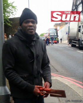 یکی از مهاجمان به نظامی انگلیسی در لندن در حال شرح دلایل اقدام خود