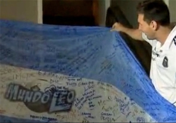 هواداران مسی در سراسر جهان یک پرچم امضا شده را به او اهدا کردند.