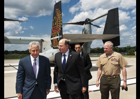 وزرای دفاع آمریکا و اسراییل از هواپیمای V-22 پیاده می شوند