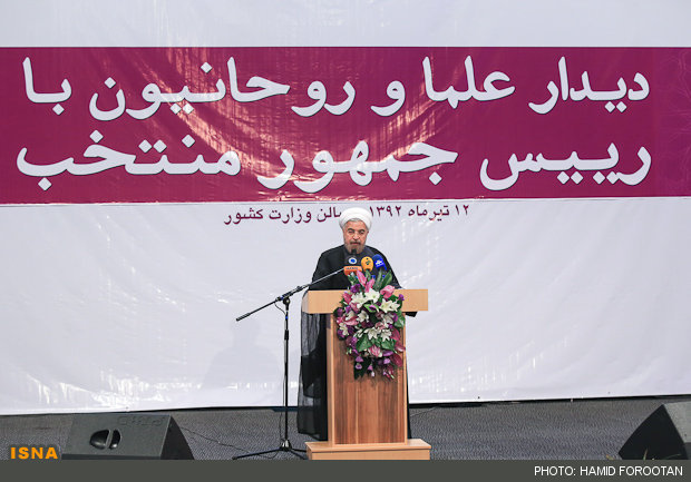 به گزارش ایسنا، حسن روحانی صبح امروز در دیدار با تعدادی از علما و روحانیون که در سالن وزارت کشور برگزار شده بود با گرامیداشت یاد تمام شهدا و ایثارگران به ویژه شهدای 12 تیر ماه 1367 ( شهدای هواپیمای ایرباس ساقط شده توسط ناو آمریکایی) گفت: حضور من در این جمع شکوهمند که تعدادی از علما و ائمه جماعات حضور دارند ابتدا برای عرض تشکر و سپاس است ، همه اقشار و همه مردم در این انتخابات شکوهمند، تلاش و ایثارکردند و روحانیت نیز در این زمینه نقش بسیار ارزشمندی ایفا کرد.