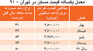 مركز آمار ايران ديروز گزارش تكميلي از نحوه نوسان فصلي قيمت مسكن در پايتخت طي يك سال 91 را منتشر كرد و با اعلام ارزش معاملات مربوط به فصل زمستان در اين گزارش، مشخص شد: ميانگين قيمت قطعي فروش آپارتمان از متري 2 ميليون و 200 هزار تومان در روزهاي پاياني سال90 به رقم 3 ميليون و 900 هزار تومان در روزهاي پاياني سال91 رسيده؛ طوري كه در هر يك از 4 فصل سال گذشته متري حدود نيمميليون تومان –بهطور متوسط- به قيمت واحدهاي مسكوني فروشي افزوده شده است.