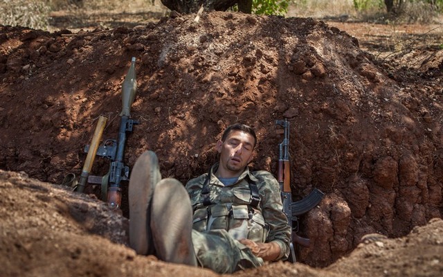 خواب یکی از نیروهای مسلح مخالف حکومت سوریه در سنگر (حومه شهر ادلب)