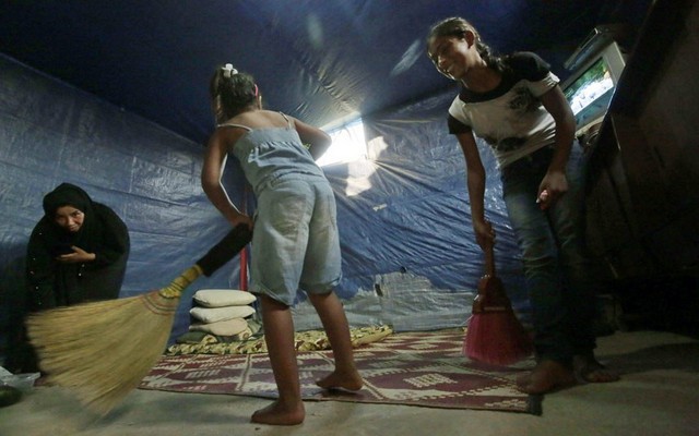 جارو کردن خانه اردوگاهی آوارگان سوری در طرابلس لبنان