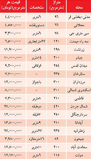 در خيابان مدني- بخشي فر ملکي 96 متري با 6 متر بر متري 4 ميليون و 400 هزار تومان به فروش مي رسد. به گزارش باشگاه خبرنگاران، قيمت ها به شرح جدول زير مي باشد: