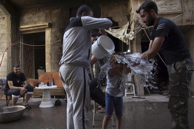 نیروهای مسلح مخالف حکومت سوریه در شهر دیر الزور در حال خنک شدن با آب
