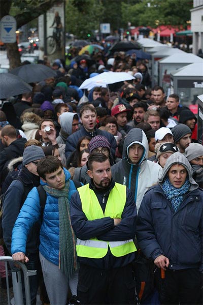 در شهرهای دیگر دنیا هم اوضاع به همین شکل بود. در سیدنی از میان جمعیت پتو و بالش به دستی که جلوی فروشگاه صف کشیده بودند، یک مرد اندونزیایی موفق شد بعد از یک روز و نیم در صف ایستادن اولین آیفون جدید دنیا را از آن خود کند و در برلین هم صدها نفر زیر باران ایستادند تا نوبت شان را برای ورود به فروشگاه اپل این شهر از دست ندهند. در لندن یکی از مشتری هایی که جلوی صف ایستاده بود در مقابل پیشنهاد وسوسه انگیز فروش نوبتش مقاومت کرد و حاضر نشد با 5هزار پوند، جایش را از دست بدهد.
