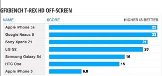 تست T-Rex 2.7 که نتایج آن برای پرچمداران روز بازار (و البته نکسوس ۵) را در بالا می بینید، از آن دست تست های سنگینی است که حداکثر فشار را به دستگاه می آورد. نکسوس ۵ با امتیاز ۲۳.۱ فریم بر ثانیه نشان داده که گرافیک آدرنو ۳۳۰ می تواند رقیبی قدر برای گرافیک PowerVR G6430 به کار رفته در آیفون 5s باشد. هر دوی آنها نیز از Open GL ES 3.0 پشتیبانی می کنند.