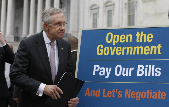 نشست خبری هری رید رهبر اکثریت دموکرات مجلس سنا آمریکا در نهمین روز از آغاز تعطیلی موقت دولت فدرال آمریکا در مقابل کنگره