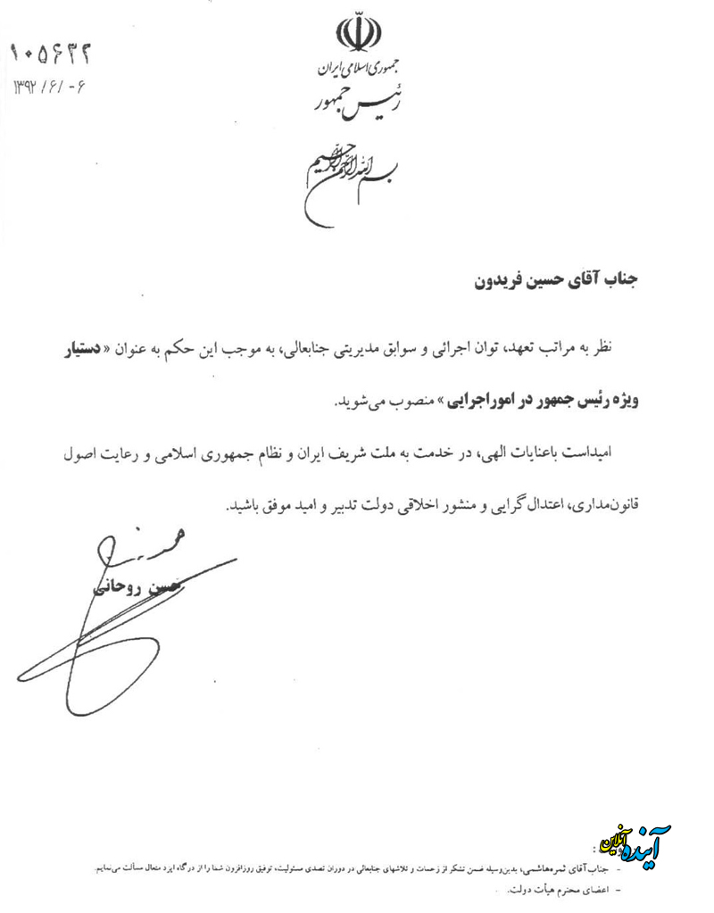سایت "آینده" تصویر حکم انتصاب حسین فریدون به عنوان دستیار ویژه رئیس جمهور در امور اجرایی را منتشر کرد.