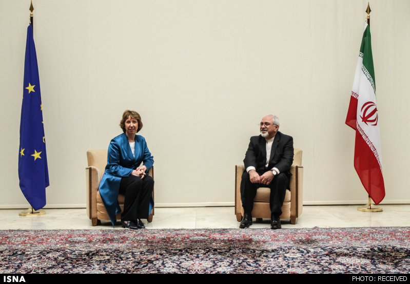 ظریف و اشتون پیش از شروع اجلاس عکسی به یادگار انداختند که البته به دلیل عارضه کمردرد ظریف دو طرف نشسته عکس گرفتند.