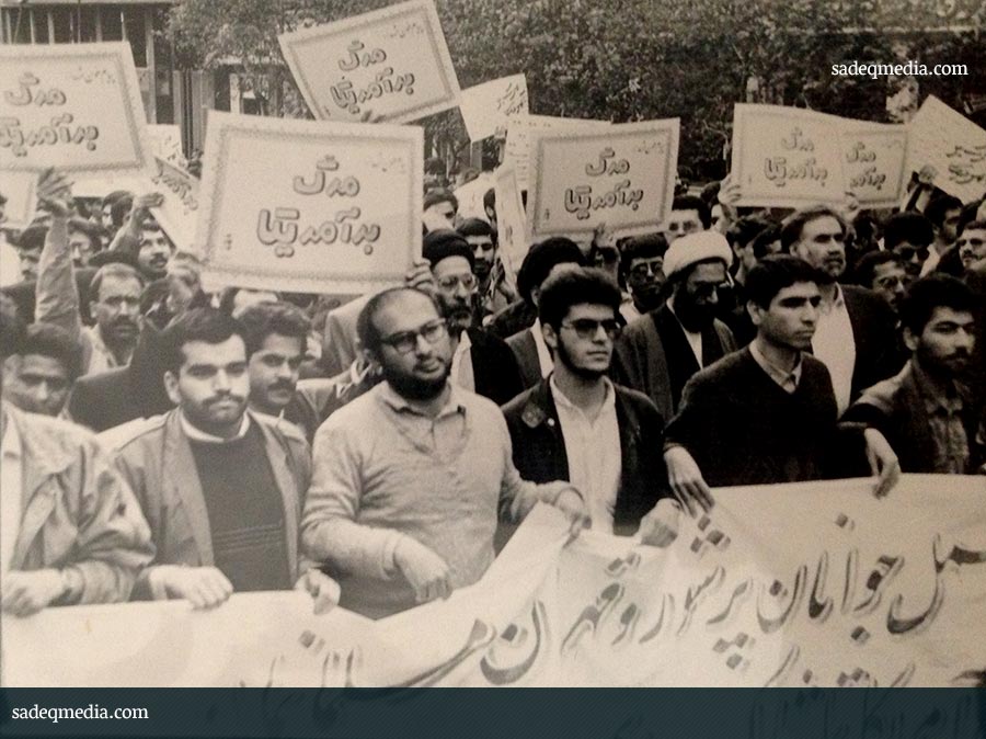 شرح عکس: در این عکس که از آلبوم شخصی سیدهادی خامنه ای برداشته شده و مربوط به اواسط دهه ۶۰ است آقا دوربینی در صف اول راهپیمایی روز ۱۳ آبان حضور دارد.