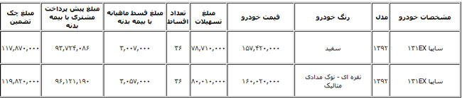 لیزینگ ملت از آغاز فروش خودرو سایپا 131 EX با اقساط 36 ماهه خبر داد. به گزارش باشگاه خبرنگاران، لیزینگ ملت محصولات شرکت سایپا را با شرایط ذیل به فروش می رساند: