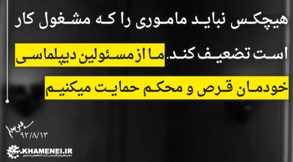 تضعیف كند. ما از مسئولان دیپلماسی خودمان قرص و محكم حمایت می كنیم.