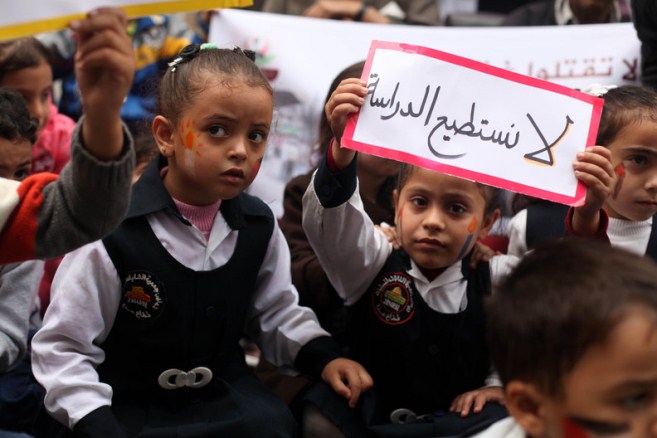 تظاهرات کودکان غزه در اعتراض به قطع مکرر برق. روی پلاکارد نوشته: نمی توانیم درس بخوانیم