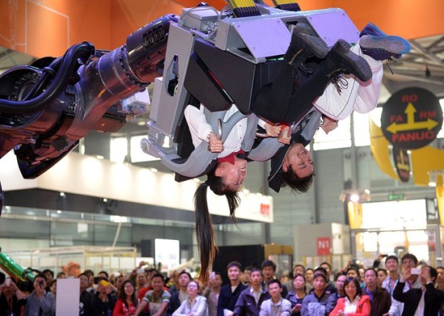 نشستن در بازوهای یک روبات در نمایشگاه بین الملی صنعت چین - شهر شانگهای