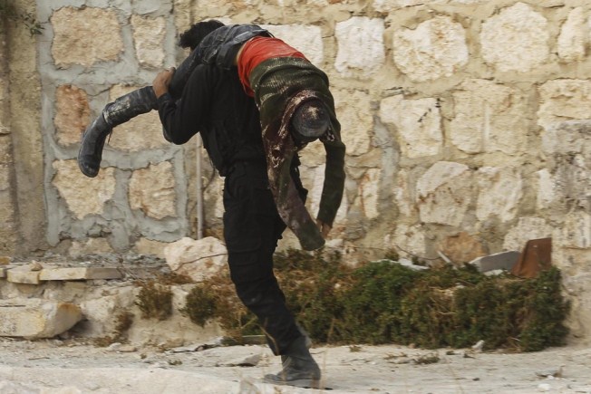 حمل جسد یک عضو ارتش آزاد سوریه (شورشیان مسلح) از سوی دوستش در نزدیکی فرودگاه حلب