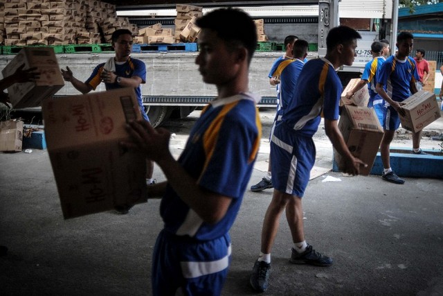 کمک های انسان دوستانه به توفان زدگان فیلیپین در حال تخلیه از یک هواپیما