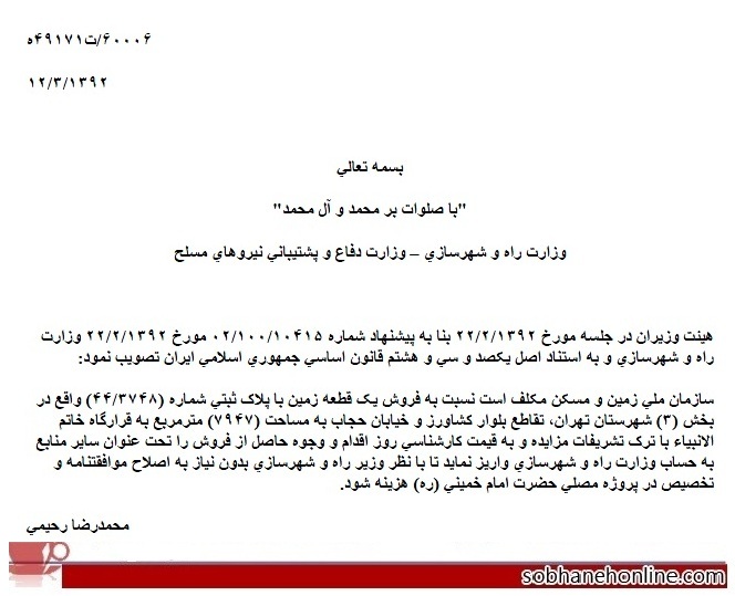 جدای از این اختلاف موجود، اسناد نشان می دهد مسئولان دولت سابق در آخرین ماههای حضور خود در مسند اجرایی، زمین این ساختمان به شماره پلاک ثبتی 3748 را بی سر و صدا به قرارگاه خاتم الانبیاء (ص) سپاه پاسداران واگذار کرده اند، بدون آنکه اطلاع دقیقی به قوه قضائیه بدهند یا اینکه قرارداد قبلی را باطل کرده باشند. بر اساس این سند مقرر شده مبلغ مذکور در ساخت مصلی امام خمینی (ره) تهران هزینه شود.