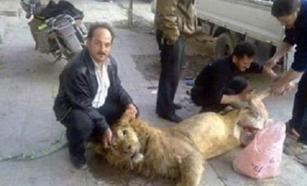 در شبکه های اجتماعی یک تصویری منتشر شد که چهار شهروند سوریه لاشه مذبوح شیر از باغ وحش را تکه تکه می کنند. این باغ وحش در طول بمباران تخریب شد .