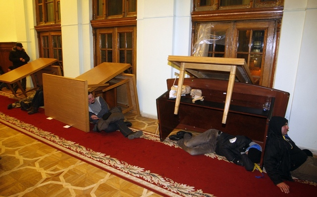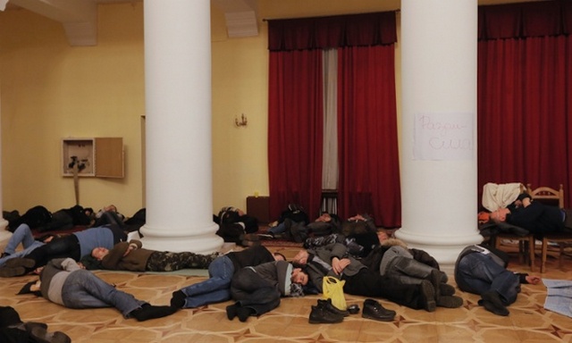 معترضان اوکراینی مخالف دولت و طرفدار پیوستن به اتحادیه اروپا که ساختمان شهرداری کیف را به اشغال خود در آورده اند شب را از بیم حمله ماموران دولت به ساختمان این گونه صبح کردند