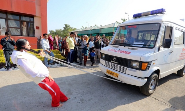 زن هندی در حال حرکت دادن یک آمبولانس با موی سر خود