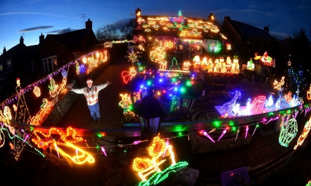 مردی 73 ساله و خوش ذوق با تلاش سه هفه ای محوطه مقابل خانه خود در یورکشایر شمالی انگلیس را برای کریسمس چراغانی کرده است