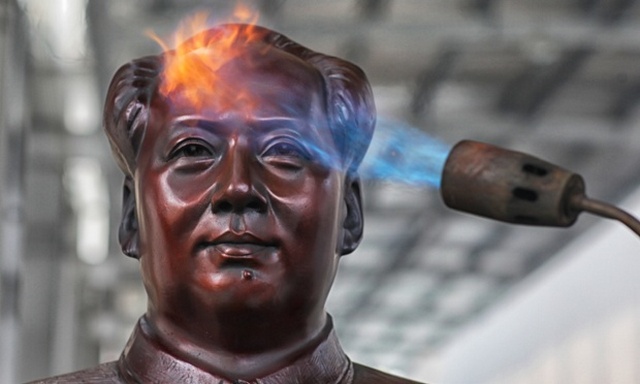 کار بر روی یک مجسمه مائو در کارخانه ساخت نمادهای مائویی در شهر شائوشان چین