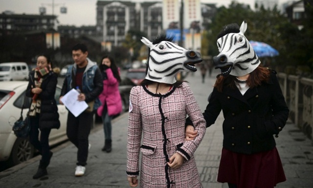دو دختر جوان با ماسک های گورخر در خیابانی در شهر چونگینگ چین