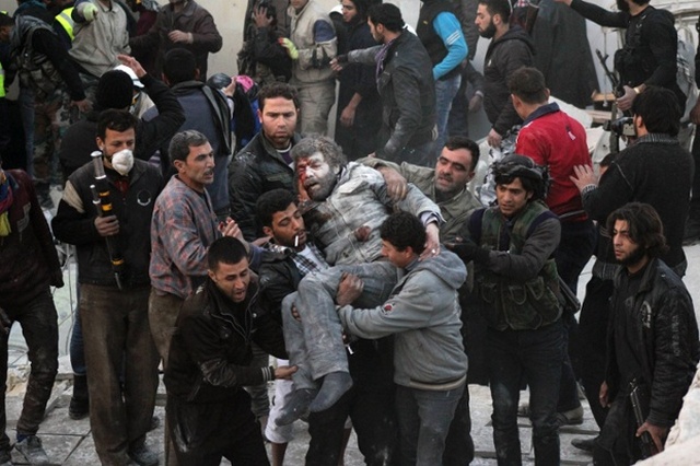 تلاش برای نجات زیر آوار ماندگان ساختمانی که در جریان حمله هوایی به حلب ویران شده است