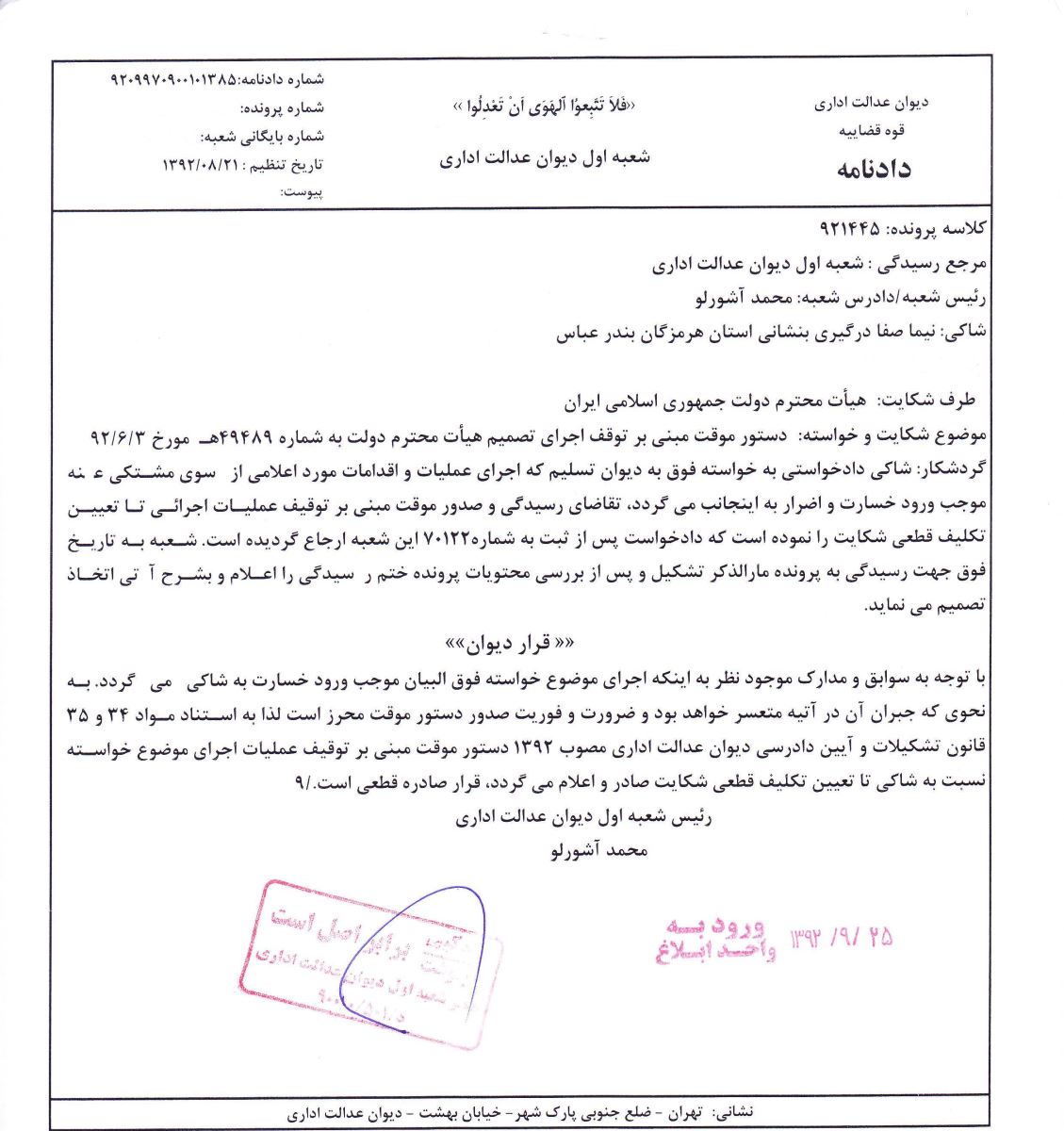نیما صفا با اشاره به صدور این رای از سوی دیوان عدالت اداری یادآور شد: همین یک پرونده خود به تنهایی نشان از حاکمیت قانون در امور کشور و استقلال قوه قضاییه است و آن همه مخفی کاری های تعجب برانگیز و قدرت نفوذ برخی حامیان این مصوبه ، نتوانست کوچکترین انحرافی را در عملکرد قانونی دیوان بوجود آورد و مطمئنا نخواهد توانست خللی در تصمیمات آتی قضات متعهد هیات عمومی دیوان عدالت اداری، ایجاد کنند.