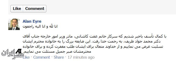 با کمال تأسف باخبر شدیم که سرکار خانم عفت کاشانی، مادر وزیر امور خارجه جناب آقای دکتر محمد جواد ظریف، به رحمت خدا رفت.