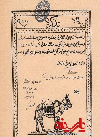 این مجوز رسمی مربوط به سال 1873 میلادی در مصر است که به صاحب الاغ اجازه می دهد بدون هیچ گونه ممنوعیتی در شهر به همراه این حیوان عبور و مرور داشته باشد. در این مجوز صادره از سوی شهرداری اسم صاحب حیوان و رنگ آن اشاره شده است.
