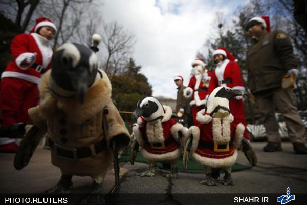 پوشاندن لباس بابانوئل به پنگوئنها برای کریسمس در یک پارک تفریحی در جنوب سئول