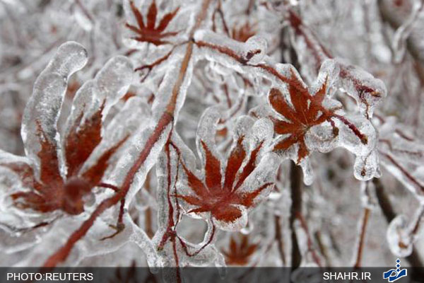 یک لایه یخ روی برگ درخت افرای ژاپنی پس از طوفان یخ در تورنتو کانادا