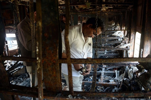 تفتیش داخل یک قطار آتش گرفته در بمبئی هند