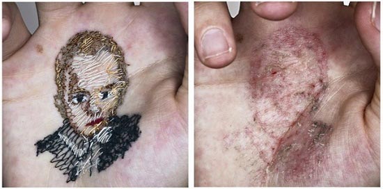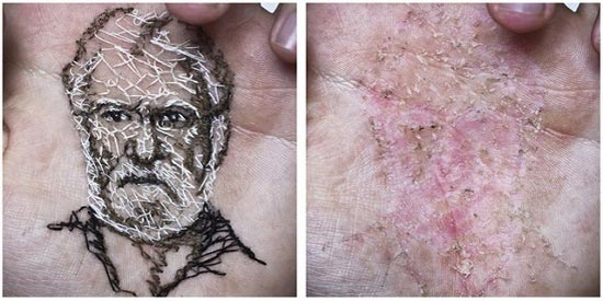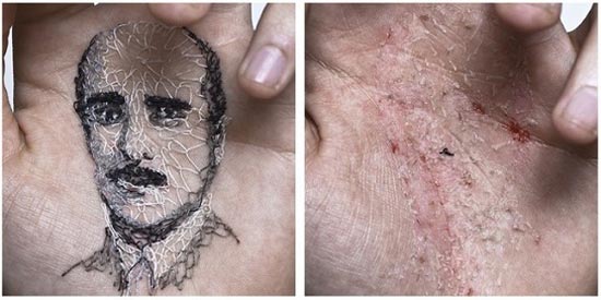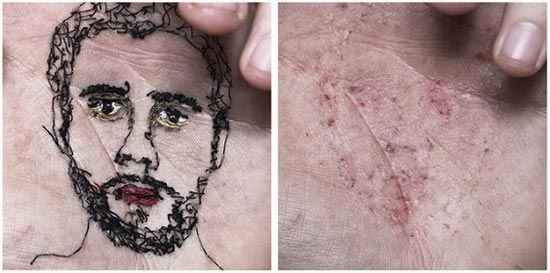 گفتنی است، ابتدا این هنرمند با سوزن طرح اولیه چهره افراد را بر روی کف دست خود حک میکند و سپس با نخهای رنگی آن را میدوزد.