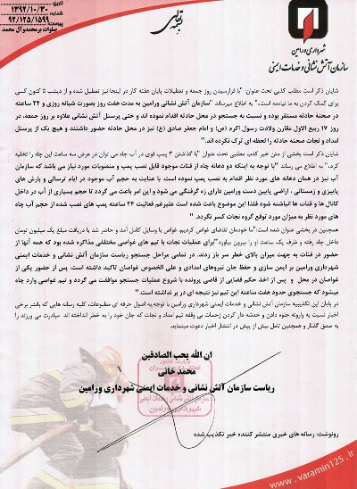 این مسئول متذکر شد: در پایان این تکذیبیه سازمان آتش نشانی و خدمات ایمنی شهرداری ورامین با توجه به اصول حرفه ای مطبوعات، کلیه رسانه هایی که با نشر برخی اخبار نسبت به وارونه جلوه دادن و خدشه دار کردن زحمات بی وقفه تیم امداد و نجات که جان خود را به خطر انداخته اند مبادرت می ورزند را به صدق گفتار و همچنین تامل بیش از پیش در انتشار اخبار دعوت می کند.