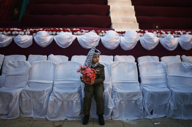 حضور یک دختر بچه با لباس نظامی در مراسم ازدواج دسته جمعی 50 زوج در غزه