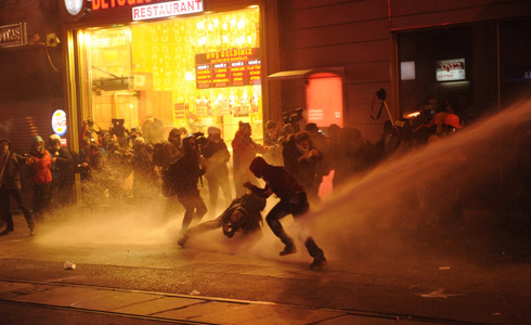 در درگیری شب گذشته پلیس استانبول با صدها مخالف طرح جدید محدودیت های اینترنتی در ترکیه، پلیس برای متفرق کردن معترضان در خیابان استقلال میدان تقسیم استانبول از گاز اشک آور و ماشین آب پاش استفاده کرد.