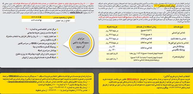 همچنین شما همواره می توانید با مراجعه به وبسایت www.isim.ir شماره موردنظر خود را از بین میلیون ها شماره انتخاب کنید و به راحتی مبلغ مربوط را به وسیله کارت های عضو شتاب بپردازید.یادآور می شود: سیمکارت «آی سیم» شما بدون پرداخت هزینه به نشانی شما تحویل می شود و مراحل ارسال را نیز می توانید ازطریق شماره تلفن 021-66123326 پیگیری کنید.