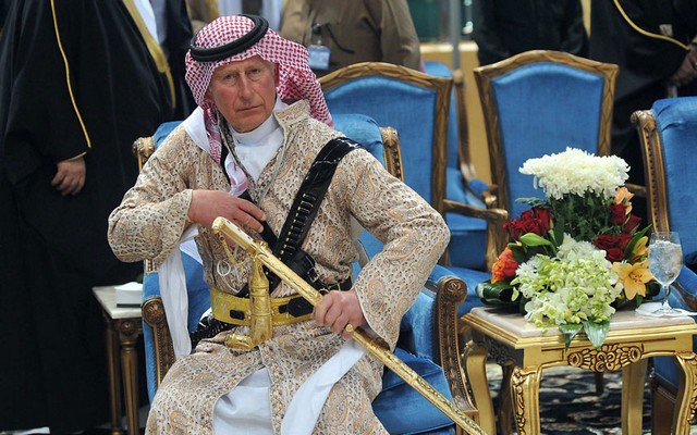 پرنس چارلز ولیعهد بریتانیا در لباس عربی و در مراسم رقص شمشیر در ریاض