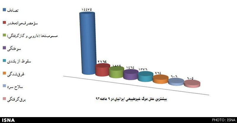 بر اساس آمار سازمان پزشکی قانونی از ابتدای سال 92 تا پایان آذر ماه تصادف، سوء مصرف مواد مخدر و مسمومیت اعم از دارویی و گازگرفتگی درصدر علل مرگهای غیرطبیعی ایرانیان بود و نگاهی به این آمار در مدت مشابه سال قبل نیز حاکی از این است که مرگهای غیرطبیعی با همین رده بندی و ترتیب به سراغ بسیاری آمده است.