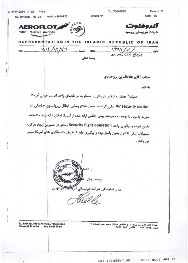 علاالدین بروجردی رئیس کمیسیون امنیت ملی و سیاست خارجی مجلس در گفتگو با باشگاه خبرنگاران به تاخیر در سفر هیئت پارلمانی ایران به کشورهای آمریکای لاتین به دلیل کارشکنی ایالت متحده آمریکا اشاره کرد و گفت: قرار بود هیئت پارلمانی ایران ساعت 4 صبح امروز - یکشنبه 11 اسفندماه - به مسکو و سپس به هاوانا پرواز کند ولی شرکت آئروفلوت (شرکت هواپیمایی روسی) اعلام کرد امنیت پرواز آمریکا مخالفت کرده و گفته این هیئت حق عبور از فضای آمریکا را ندارد.