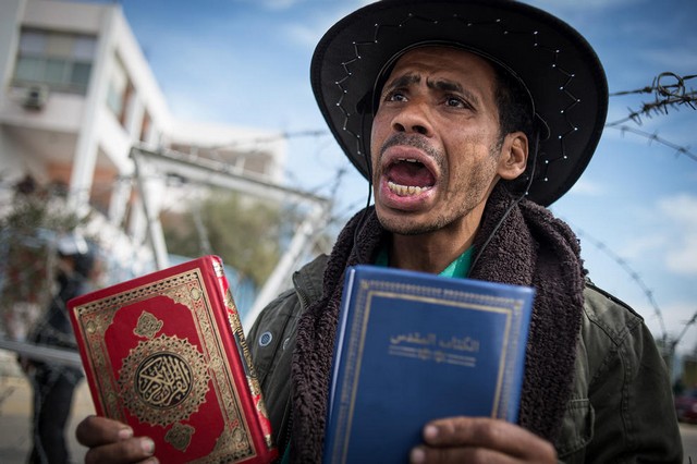 یکی از هواداران دولت موقت مصر با در دست داشتن یک جلد قرآن و انجیل در مقابل دادگاه محمد مرسی رییس جمهور مخلوع مصر در آکادمی پلیس قاهره در حال شعار دادن علیه مرسی است
