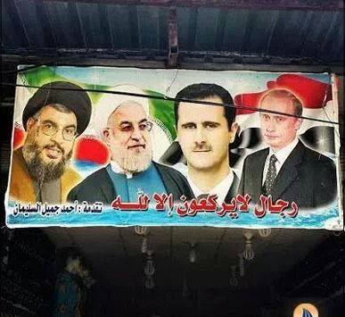 عصر ایران - بنر زیر در سوریه نصب شده است و با در کنار هم قرار دادن پوتین، اسد، روحانی و سید حسن نصر الله دبیر کل حزب الله لبنان نوشته است: مردانی که جز در برابر الله سر تعظیم فرود نمی آورند.