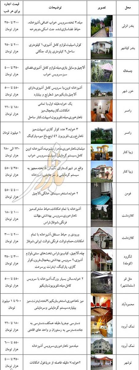 در ادامه، جدولی از نرخ اجاره ویلا در هر یک از مناطق مختلف شمال کشور تهیه کرده است تا برای کسانی که قصد سفر به این شهر را دارند حداقل قیمت را ارائه کند.