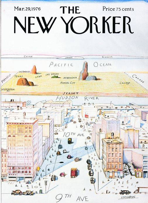 طرح روی جلد نیویورکر را (مربوط به حدود ۳۵ سال قبل): طرحی با عنوان «دنیا از خیابان نهم…»که ذهنیت جغرافیایی محدود ساکنان منهتن را به نمایش گذاشته است. آنها که فراتر از خیابان نهم، فقط خیابان دهم را میبینند! در افقهای دوردست چند ایالت را بسیار «ریز» میبینند و در آن سوی اقیانوسها هم تنها سه کشور: «چین. ژاپن و روسیه». / منبع: سایت محمدرضا شعبانعلی