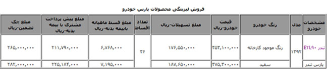 شرکت واسپاری ملت از آغاز فروش اقساطی خودروهای تندر90 پارس خودرو و پارس تندر خبر داد.به گزارش باشگاه خبرنگاران، تعداد اقساط اعلام شده از سوی لیزینگ ملت 36 قسط است. جدول منتشر شده نیز به شرح زیر است: