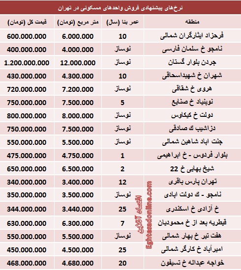 آنچه در زیر می‌آید جدول قیمت روز انواع آپارتمان های 100 متری در مناطق مختلف شهرداری تهران به پیشنهاد مالک است؛
